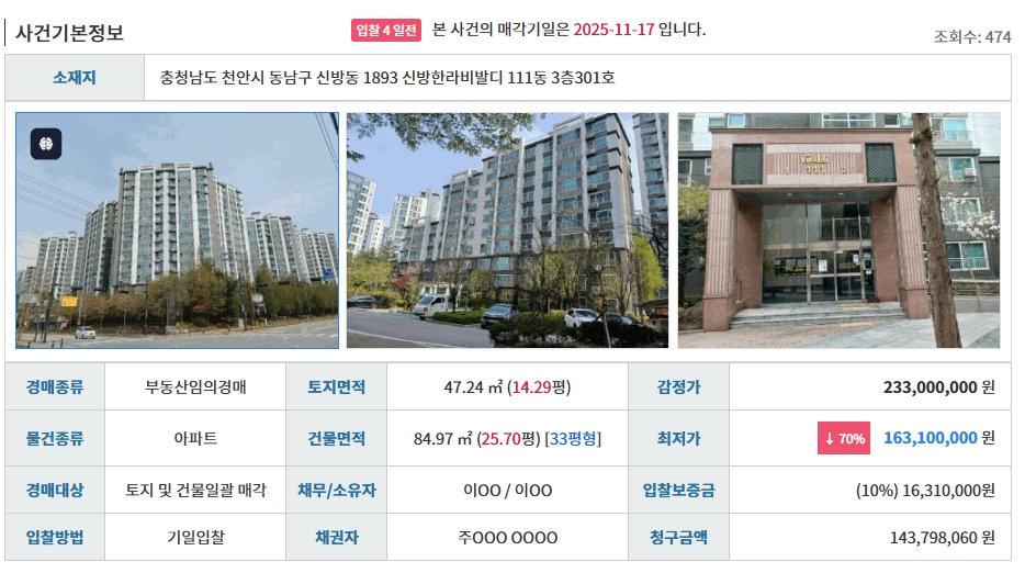 2025 타경 468 사건은 천안시 동남구 신방동에 위치한 신방한라비발디 아파트 84.97㎡ 물건으로, 실거주 수요와 투자 수익률을 모두 고려해 볼 수 있는 경매 대상입니다. 이 글에서는 기준 시세 설정, 세후 수익률 분석, 입찰가 계산까지 실전 입찰을 위한 전 과정을 상세히 다룹니다.